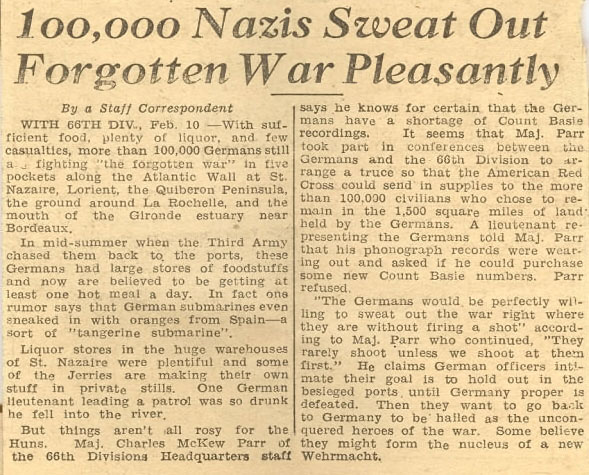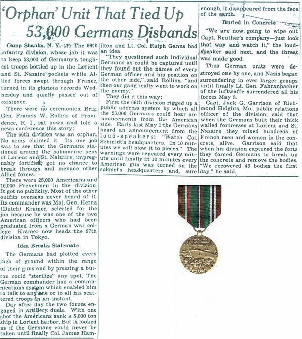 Once in France, Panthermen fought in a campaign that is most often referred to as the "Forgotten War", their mission was to contain 53,000 German troops in and around St. Nazaire and Lorient pockets in Northern France. This was done to prevent the enemy from breaking out and harassing allied forces that were sweeping across Europe. There were 14 submarine pens located in St. Nazaire and another 3 in the Lorient. The enemy was dug in with some of the toughest troops Germany had to offer. Artillery duels, limited objective attacks, patrolling, harassing and capturing enemy personnel were carried out. Panthermen's deadly artillery eventually bombed the Lorient pocket back into the Stone Age breaking the fighting spirit of the Germans. General Fahrmbacher commander of German forces surrendered to the 66th's General Herman Kramer on May 8, 1945 and General Junck, commander of the enemy forces in St. Nazaire surrendered on May 11, 1945. The war was over in Europe. After occupation duty in Germany and operating processing camps in Southern France, the 66th Division was deactivated without any ceremony on November 8, 1945. Many Panthermen were transferred to the famous 42nd Rainbow Division for occupation duty in Austria.